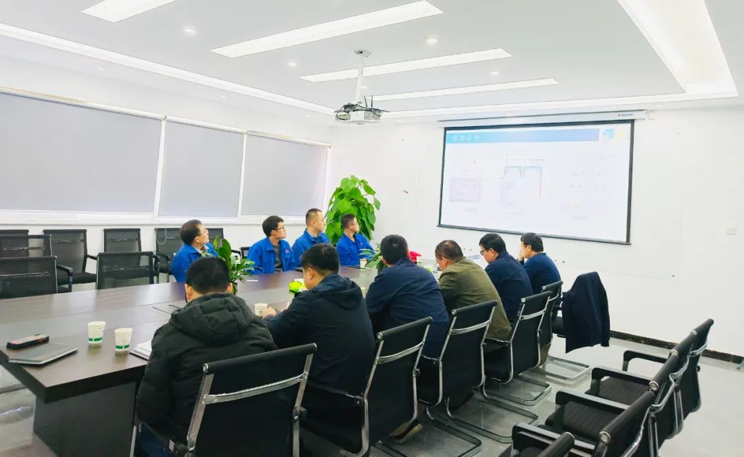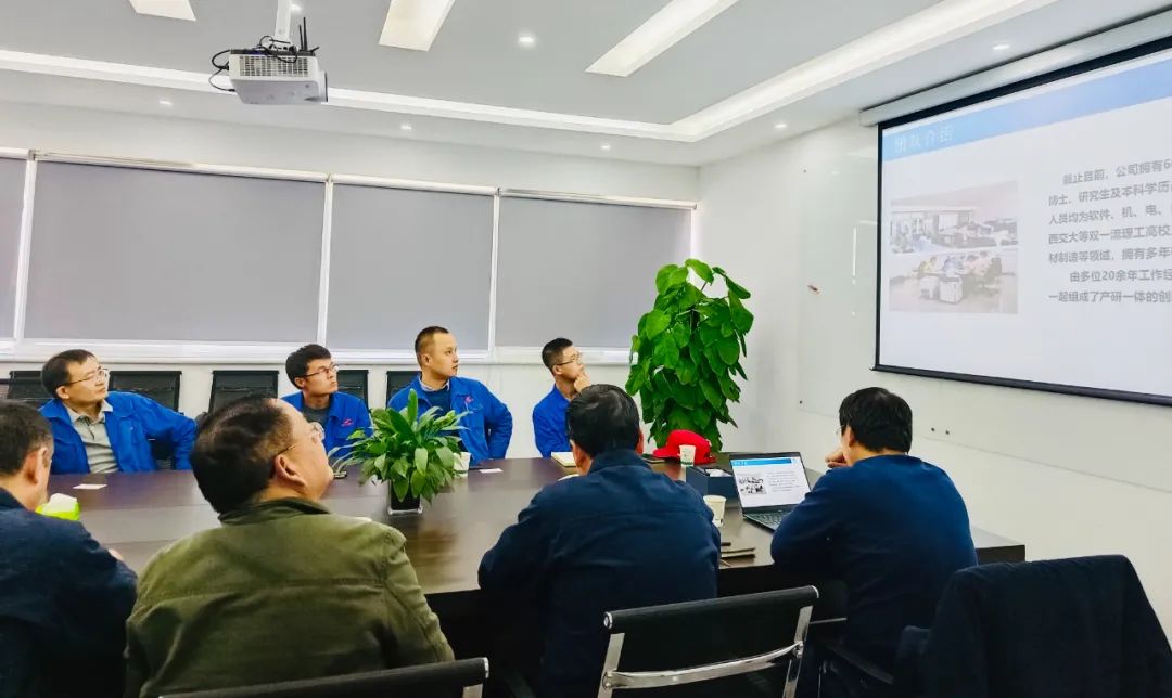 参观结束后在公司三楼会议室,由我司副总经理葛总就风润智能研究院的发展历程、业务板块以及产品案例进行了详细的讲解.到访领导及人员认真聆听,并在会上对同力重工在焊接机器人工作站、自动上下料和AGV物流小车等方面的相关需求进行了重点探讨.